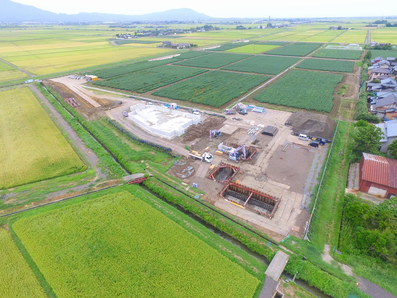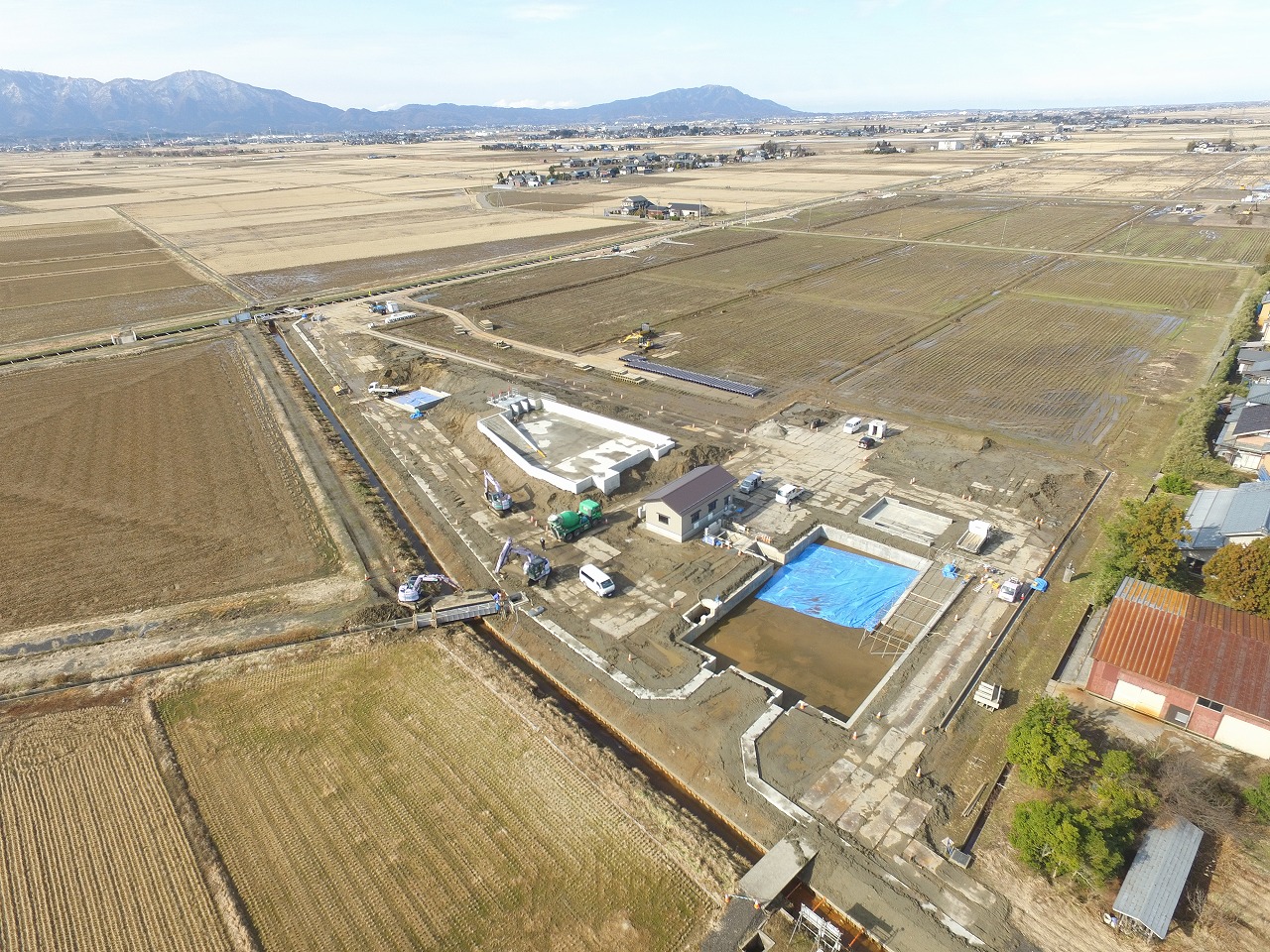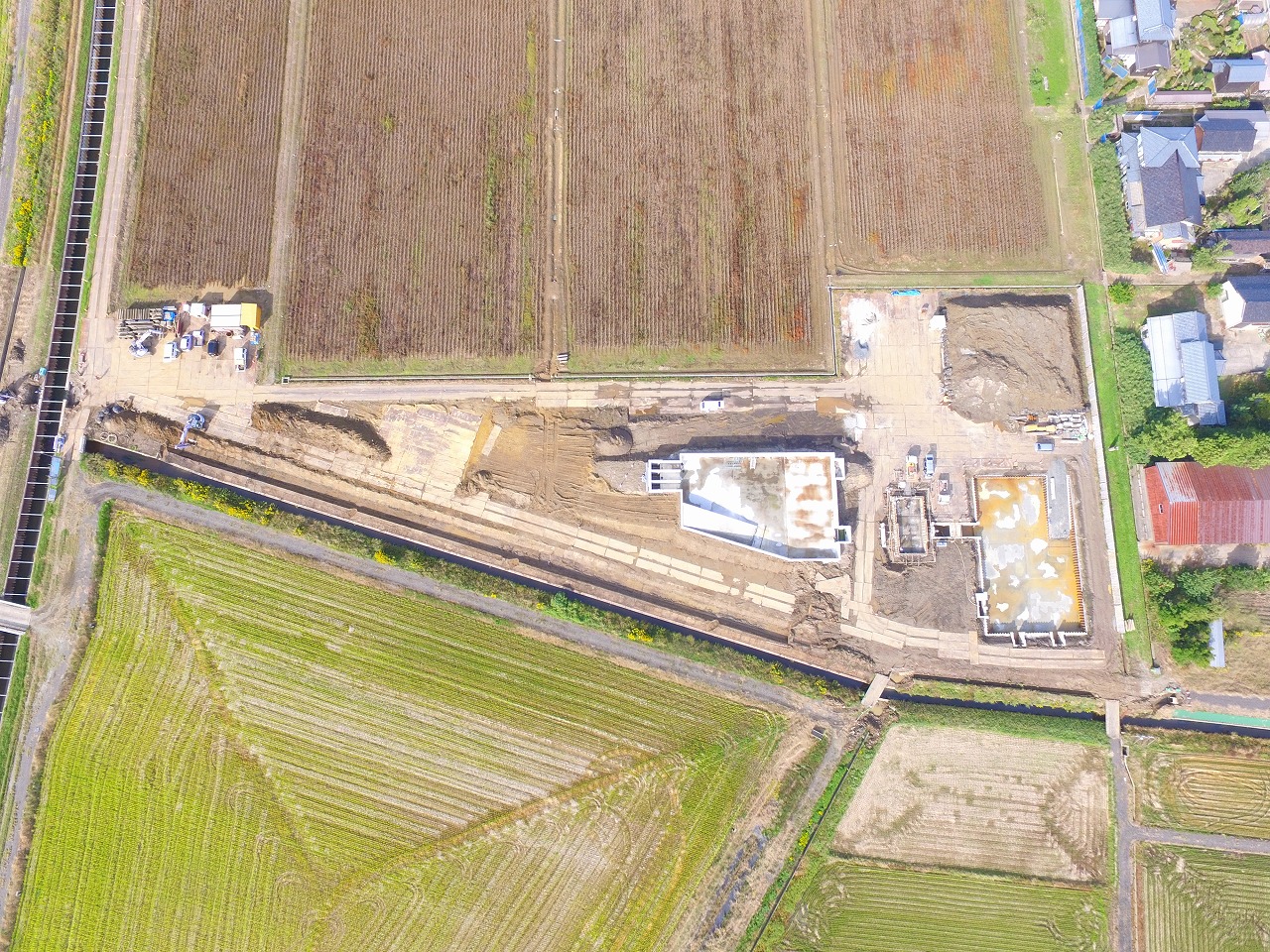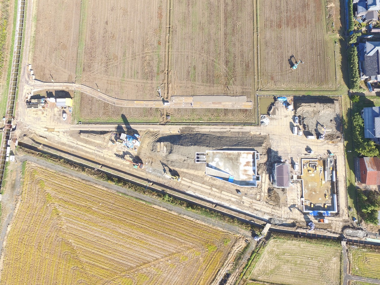 前月と比べると周りの田畑は土になり、調整池のコンクリート打設も完了しています。