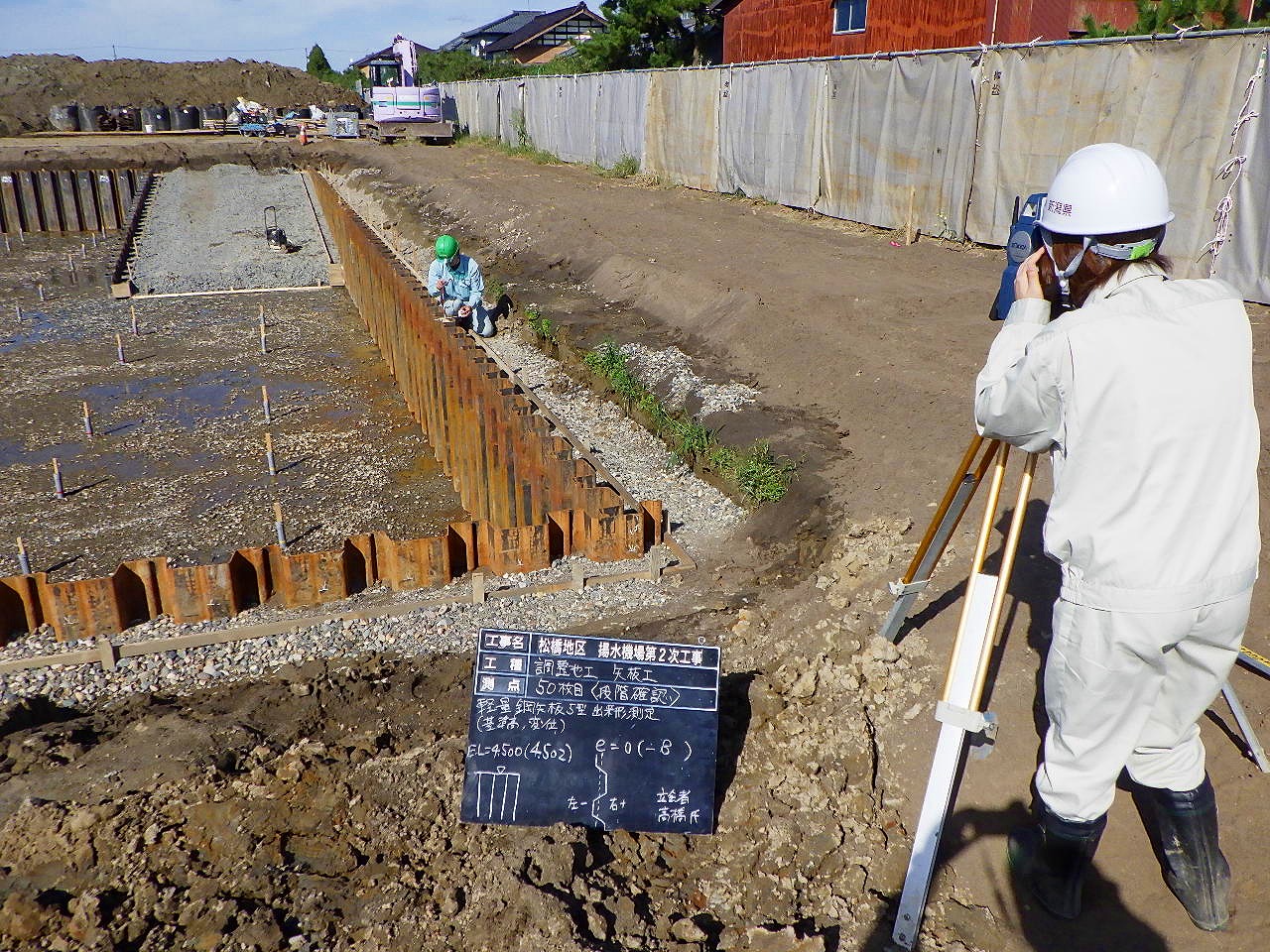 調整池に鋼矢板の打込みが完了したので、発注者立会いのもと段階確認を行いました。