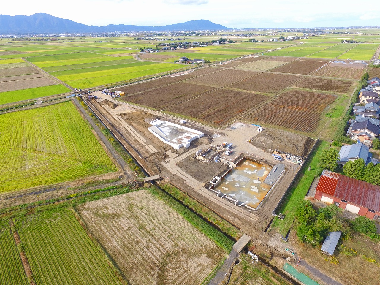 前月と比べると周りの田畑は土になり、調整池のコンクリート打設も完了しています。
